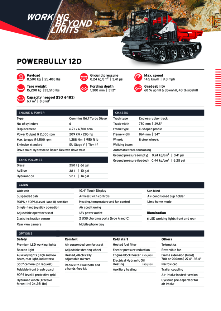 With a fording depth of 1,400 mm (51.2′′) PowerBully masters flooded areas or swamps effortlessly.